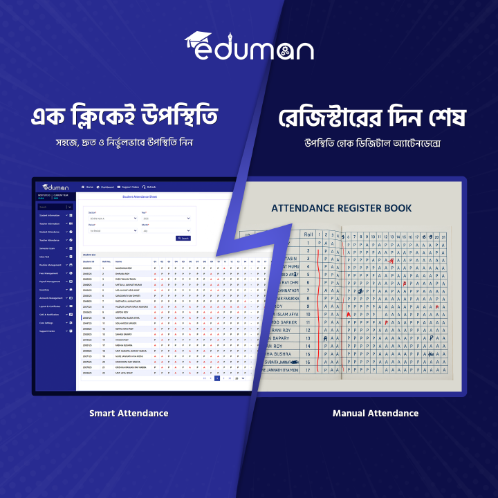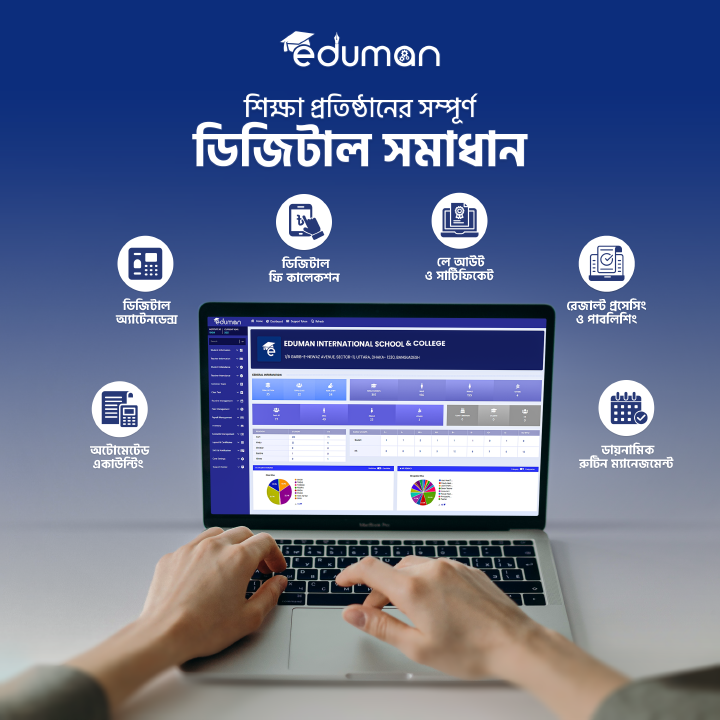 শিক্ষক-শিক্ষার্থীদের বায়োমেট্রিক হাজিরা, তাৎক্ষণিক সার্ভারে আপডেট, উপস্থিতি-অনুপস্থিতির এসএমএস অভিভাবকের কাছে পৌঁছানো, এক্সাম অ্যাটেনডেন্স , ক্যাটাগরি ভিত্তিক ড্যাশবোর্ড রিপোর্ট সব কিছুই নিমিষেই পাবেন এডুম্যানে।