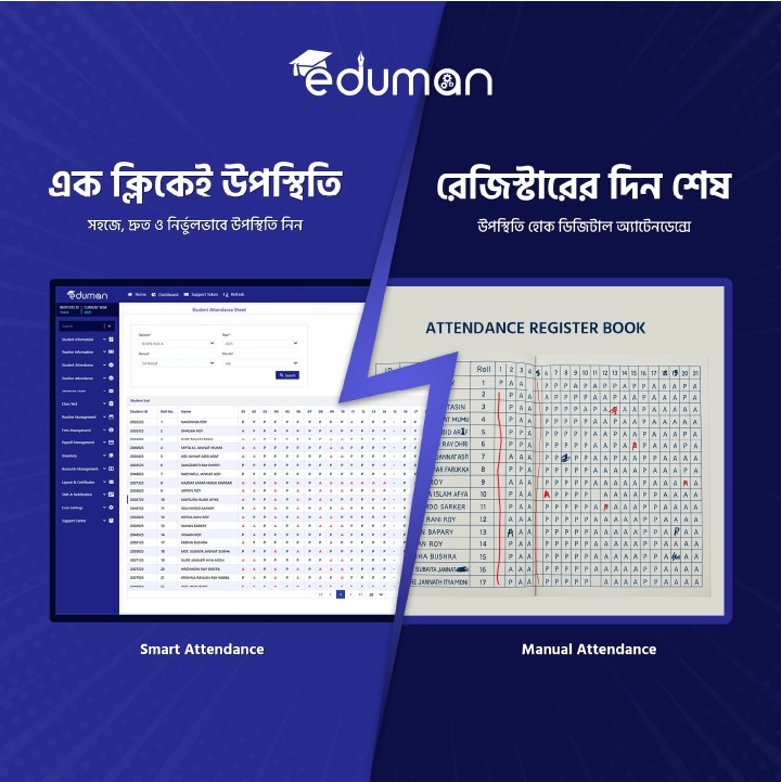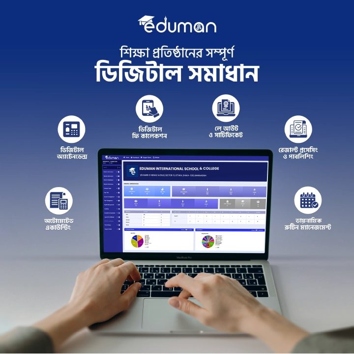 এডুম্যান বাংলাদেশের সর্বাধিক ব্যবহৃত একটি সহজ, পরীক্ষিত এবং নির্ভুল এডুকেশন ম্যানেজমেন্ট সফটওয়্যার, যা স্কুল, কলেজ ও মাদ্রাসার প্রশাসনিক কাজগুলো দ্রুত এবং সঠিকভাবে সম্পন্ন করতে সহায়তা করে। ফলে, প্রতিষ্ঠানের গতি বাড়ে ২০০-৩০০ গুণ। ৭০% ক্লারিক্যাল কাজের বোঝা কমিয়ে অযথা পরিশ্রম ও সময় বাঁচাতে সাহায্য করে। প্রায় ৫০% অসন্তোষ এবং ভূল-বুঝাবুঝি কমিয়ে দেয় স্বস্তি ও শান্তি। সেই সাথে বাঁচায় বিপুল পরিমান অর্থ।
