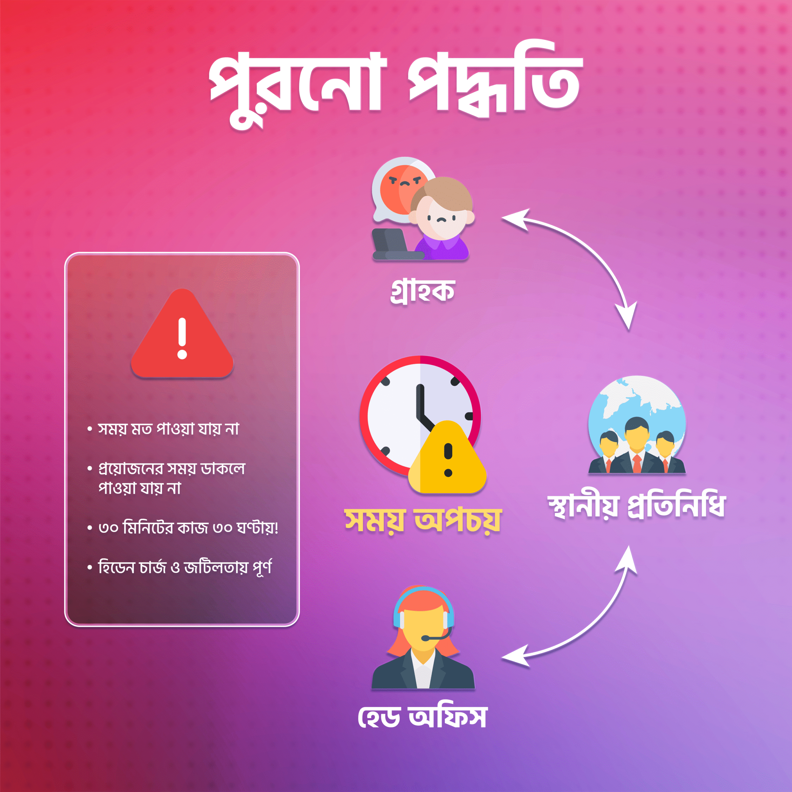 হেড অফিসের পরিবর্তে তৃতীয় পক্ষের মাধ্যমে সাপোর্ট দেওয়া হতো, ফলে সময়ক্ষেপণ ও তথ্যের অসঙ্গতি দেখা দিত।এই পরিস্থিতি গ্রাহকের হয়রানি, অসন্তুষ্টি ও সেবার মান- অবনমন ঘটাতো।
